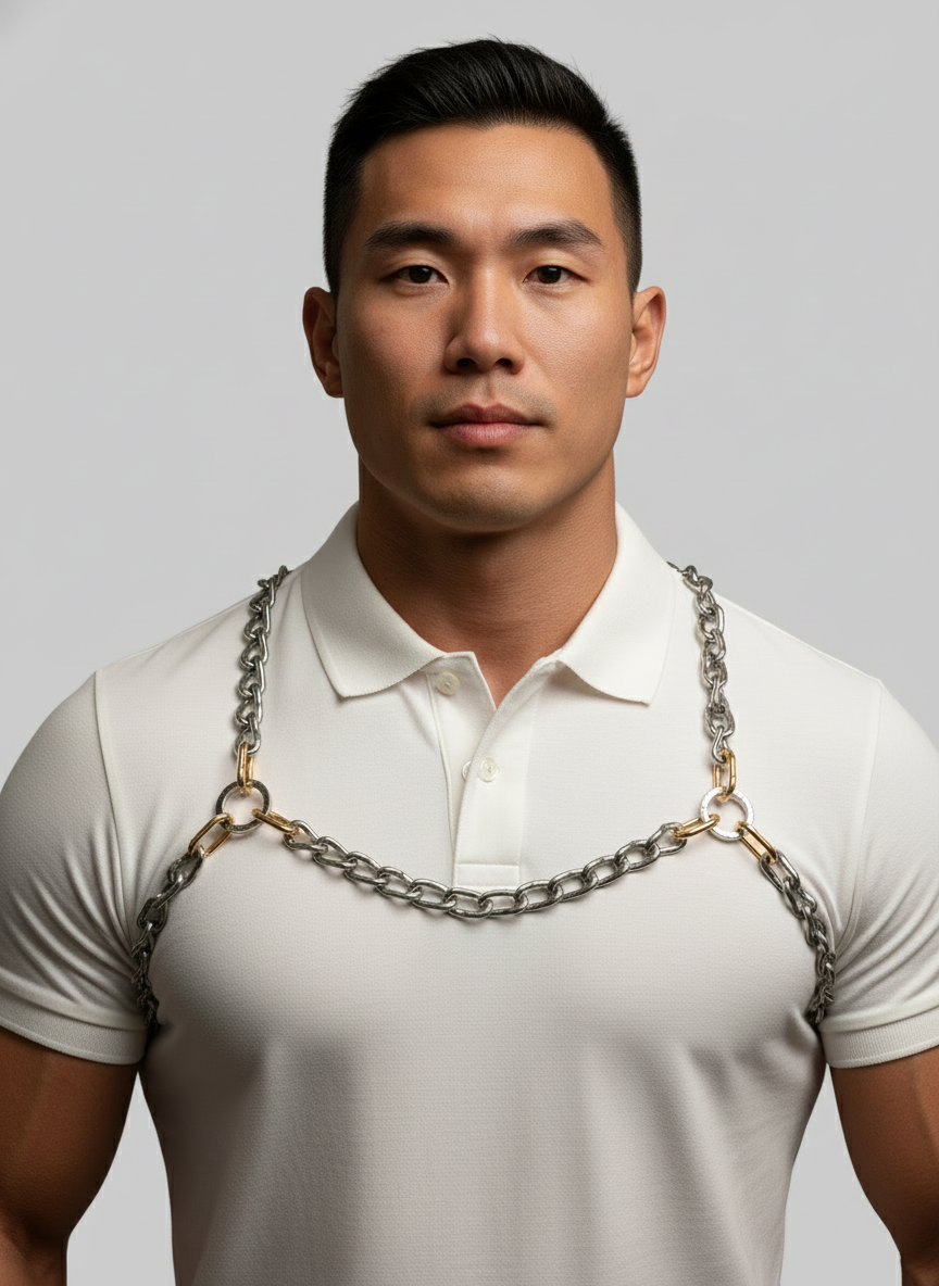 Elevate your look with the Military Green X Harness / Overlay. Featuring twisted stainless steel chains across the chest, connected with bold gold color rings and clips, this piece makes a powerful statement whether layered over a tee or worn directly on the skin.